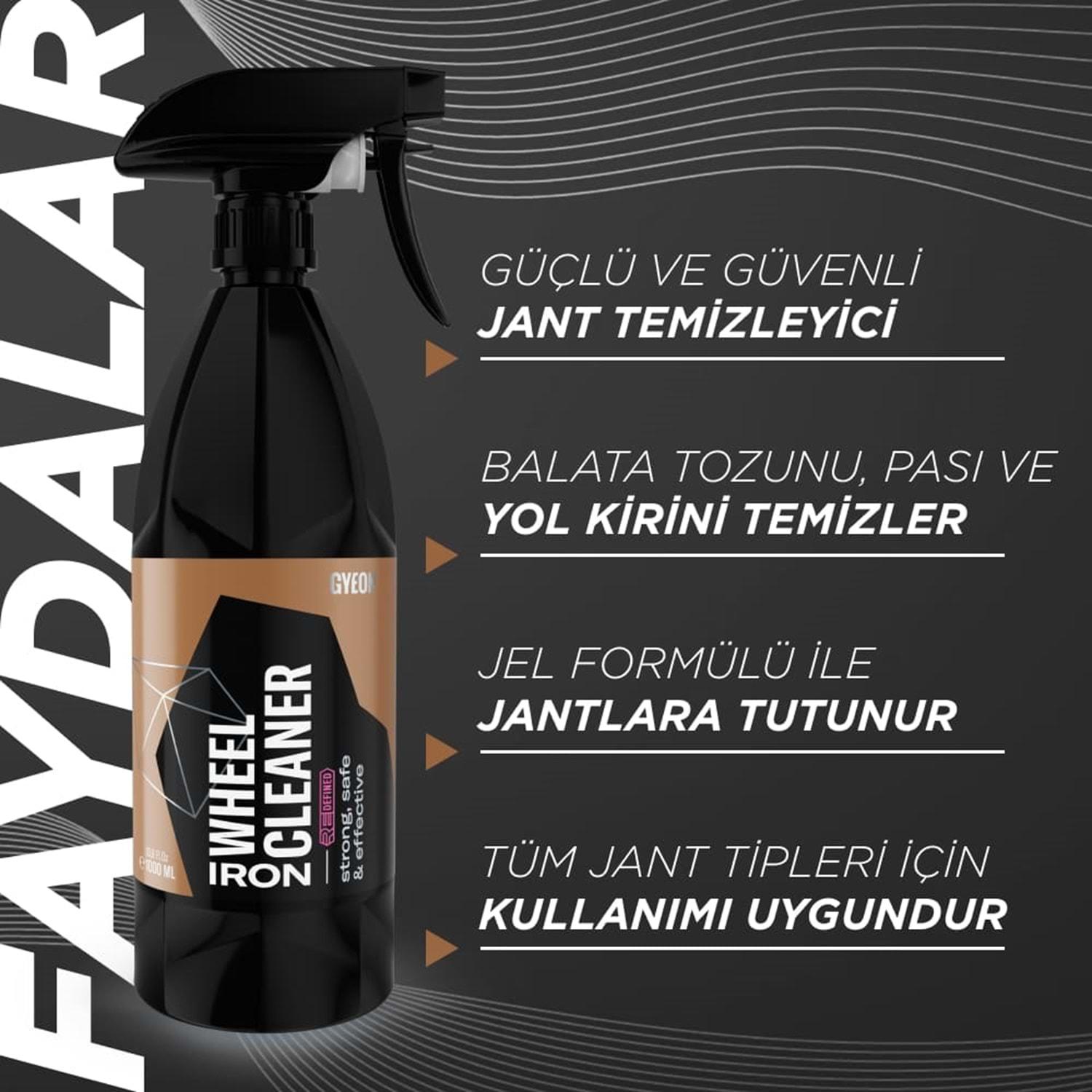 GYEON Q²M Iron WheelCleaner REDEFINED, jel formülüyle jant yüzeyine sıkıca yapışır, fren tozu ve inorganik kirleri kimyasal olarak çözer. 1–2 dakikada demir ve balata kalıntılarını yok ederken, tüm jant tiplerinde güvenle kullanılır. Yenilenen formülü, güçlü temizliğe rağmen parlak, saten veya mat finisajları korur.