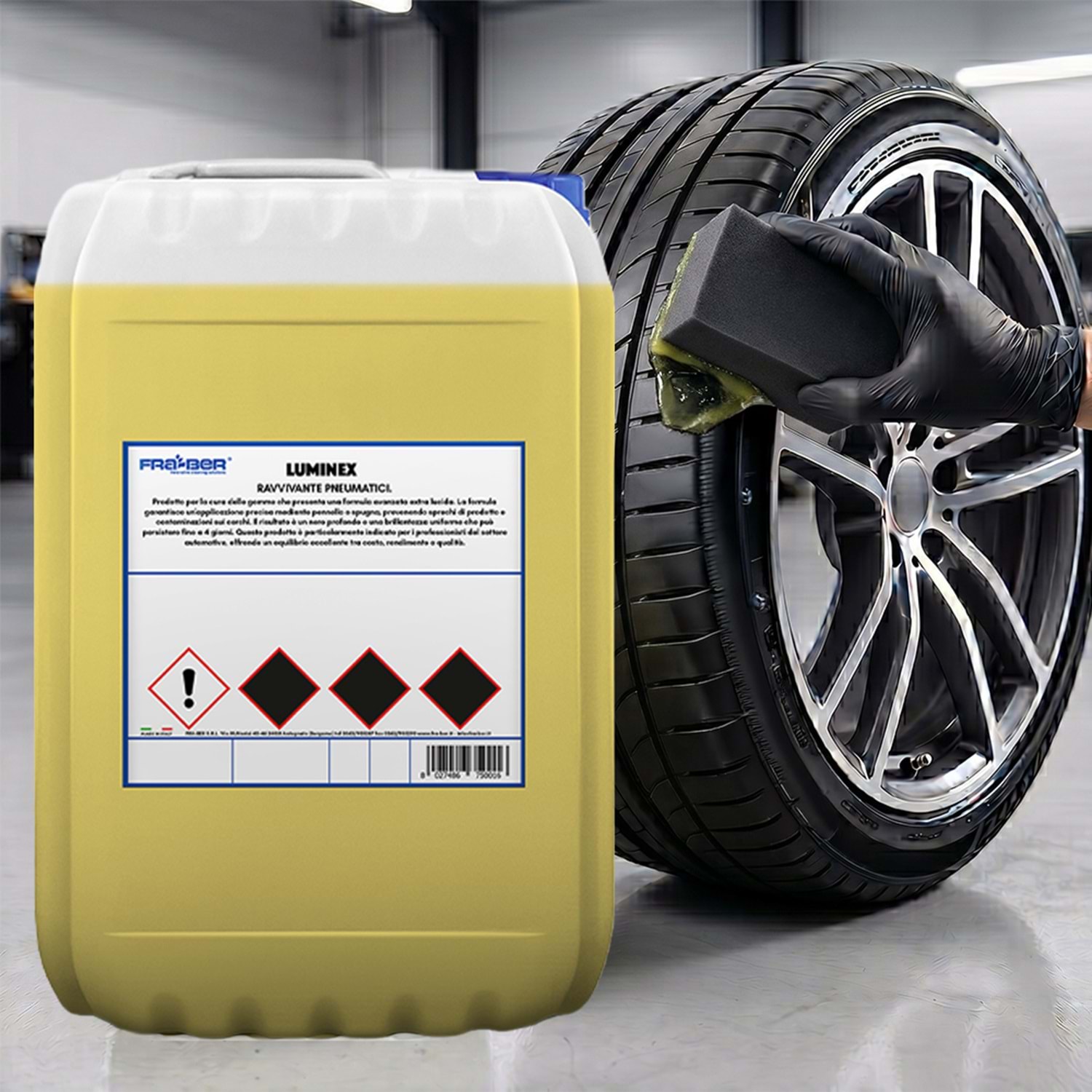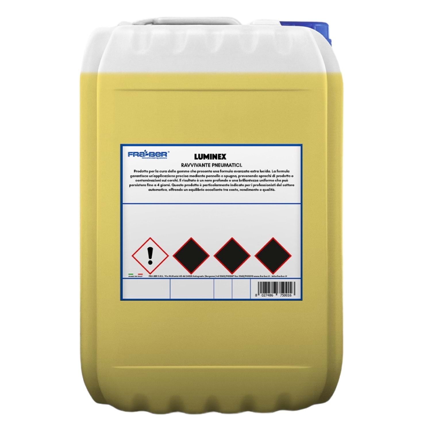 Fra-Ber Luminex’in 25 kg’lık dev ambalajı, profesyonel oto yıkama merkezleri, detaylandırma (detailing) stüdyoları ve araç filoları için özel olarak tasarlanmıştır. Jel yapısı, su bazlı, 1:2 konsantre formülü sayesinde işletmeler için oldukça ekonomik, tam bir fiyat/performans ürünüdür.4 güne kadar lastiklerde dayanım sağlar. Daha uzun kalıcılık ve parlaklık için saf olarak da kullanılabilir.