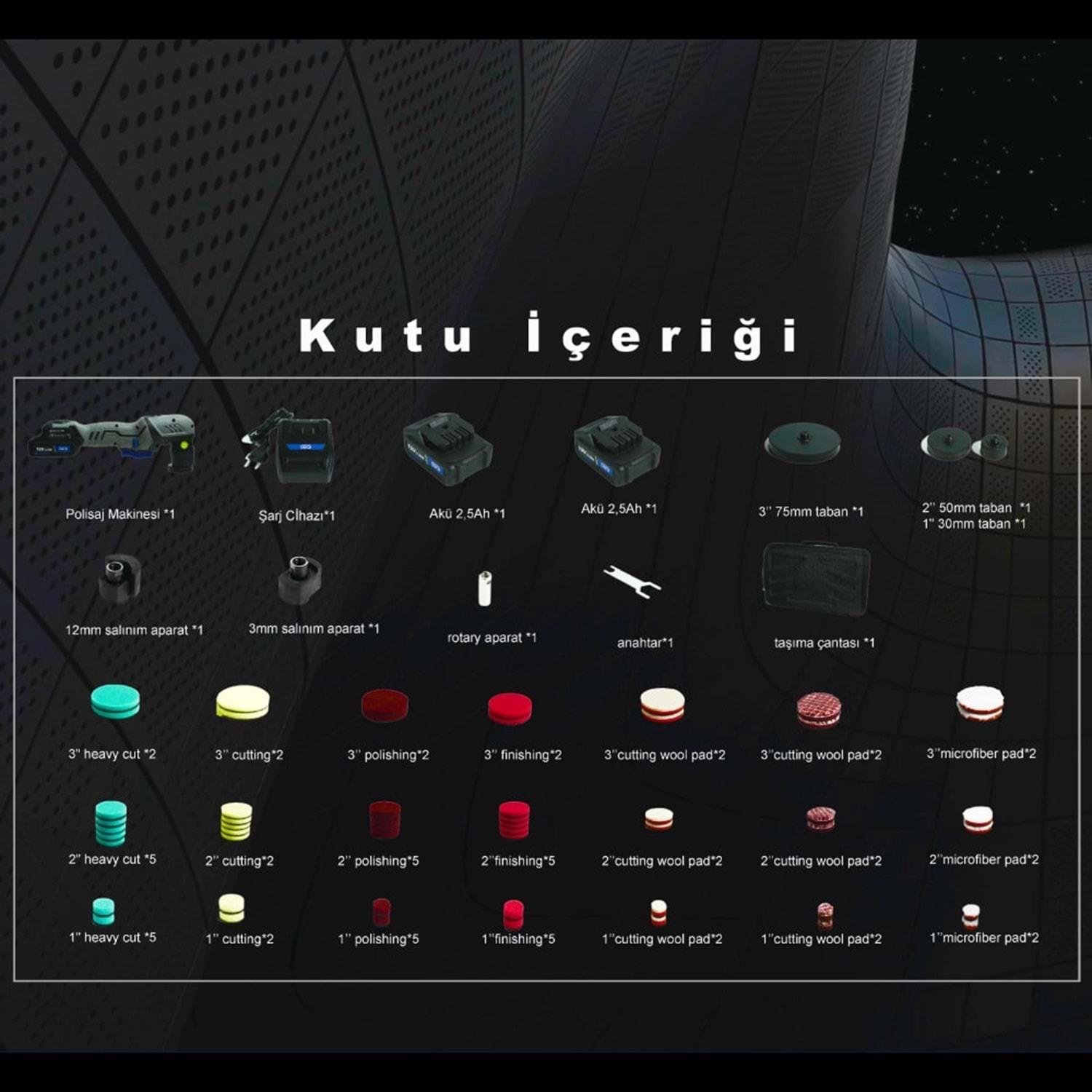 • Zengin Aksesuar Seti: Çeşitli pedler, keçeler, tabanlıklar, salınım aparatı, şarj cihazı, taşıma çantası ve 2 adet aküyle tam donanımlı bir çözüm sunar.
